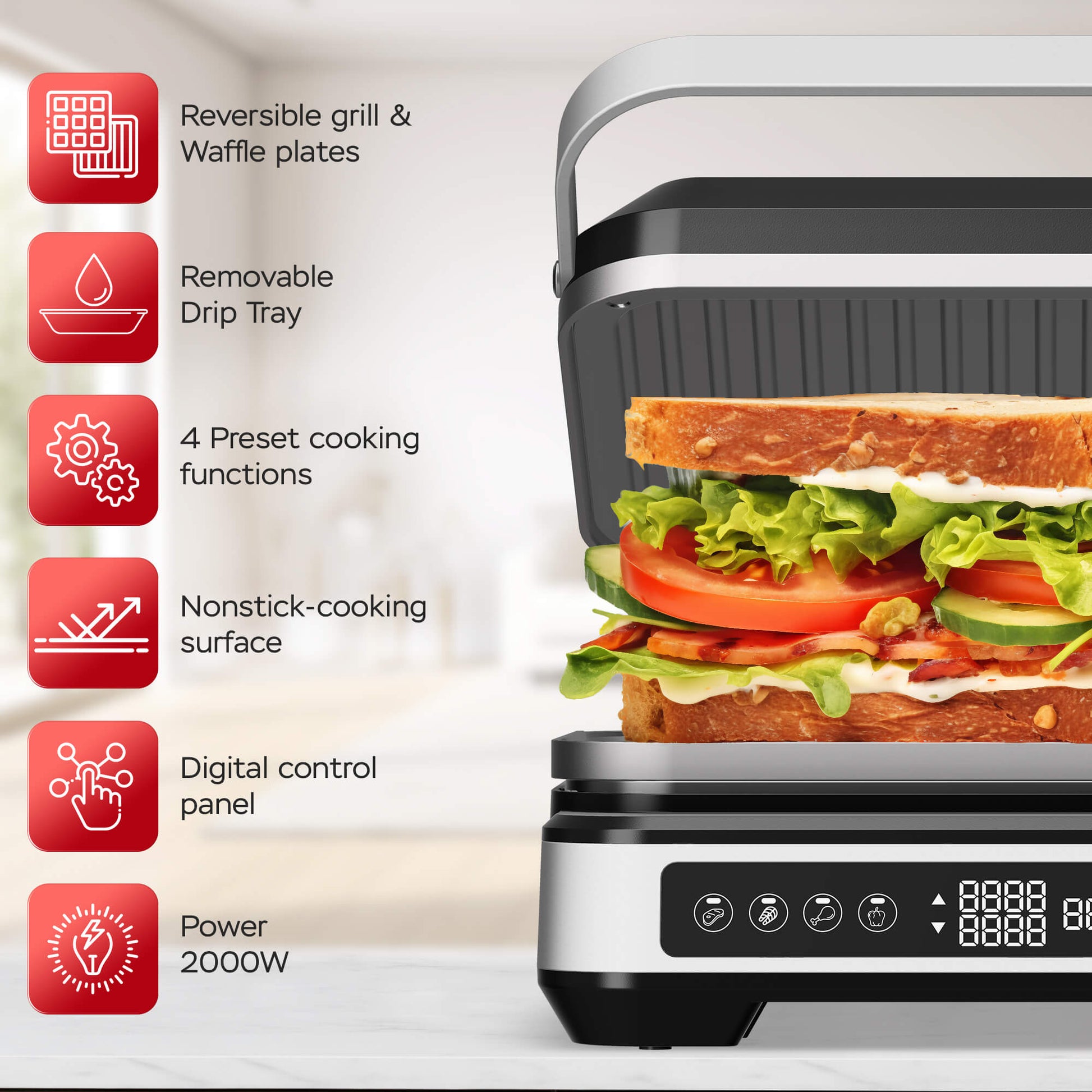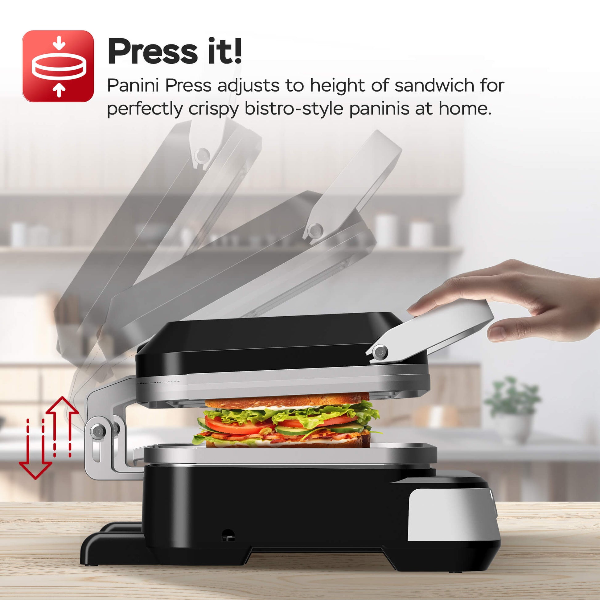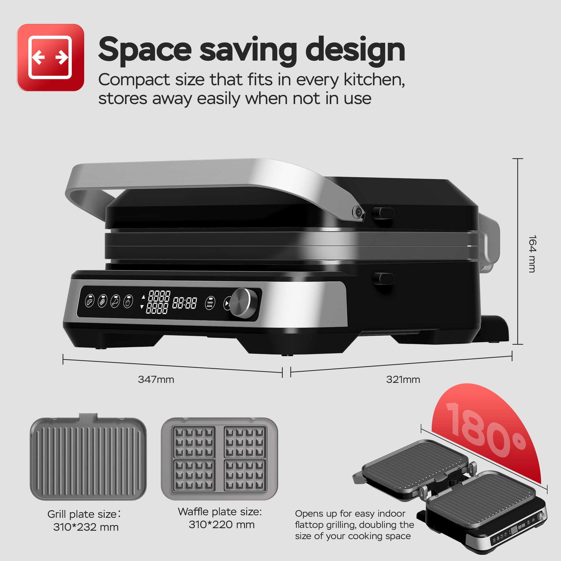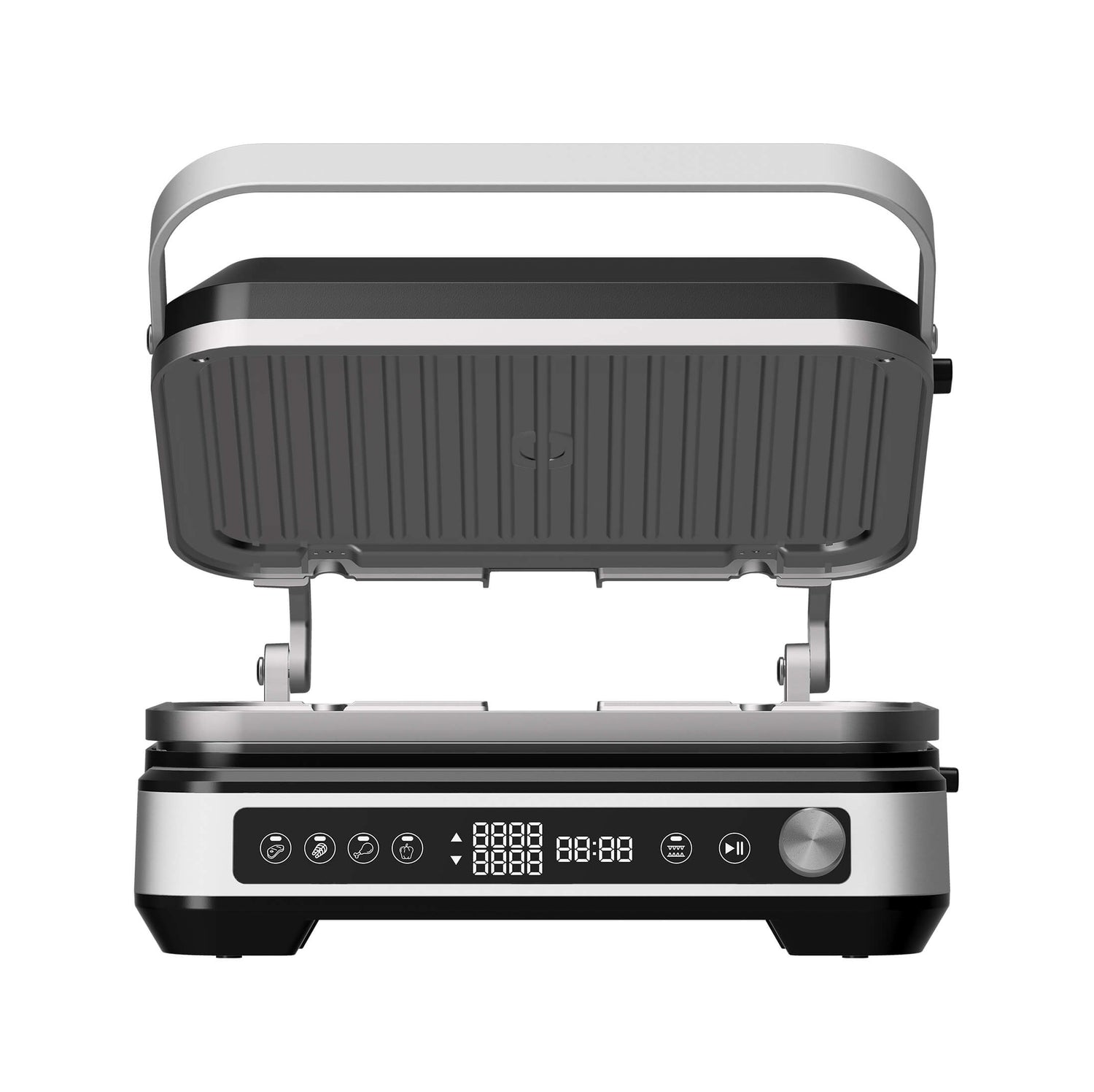 Удвоете площта за готвене, като разтворите грила на 180°, и регулирайте нагряването на горната и долната плоча независимо една от друга.