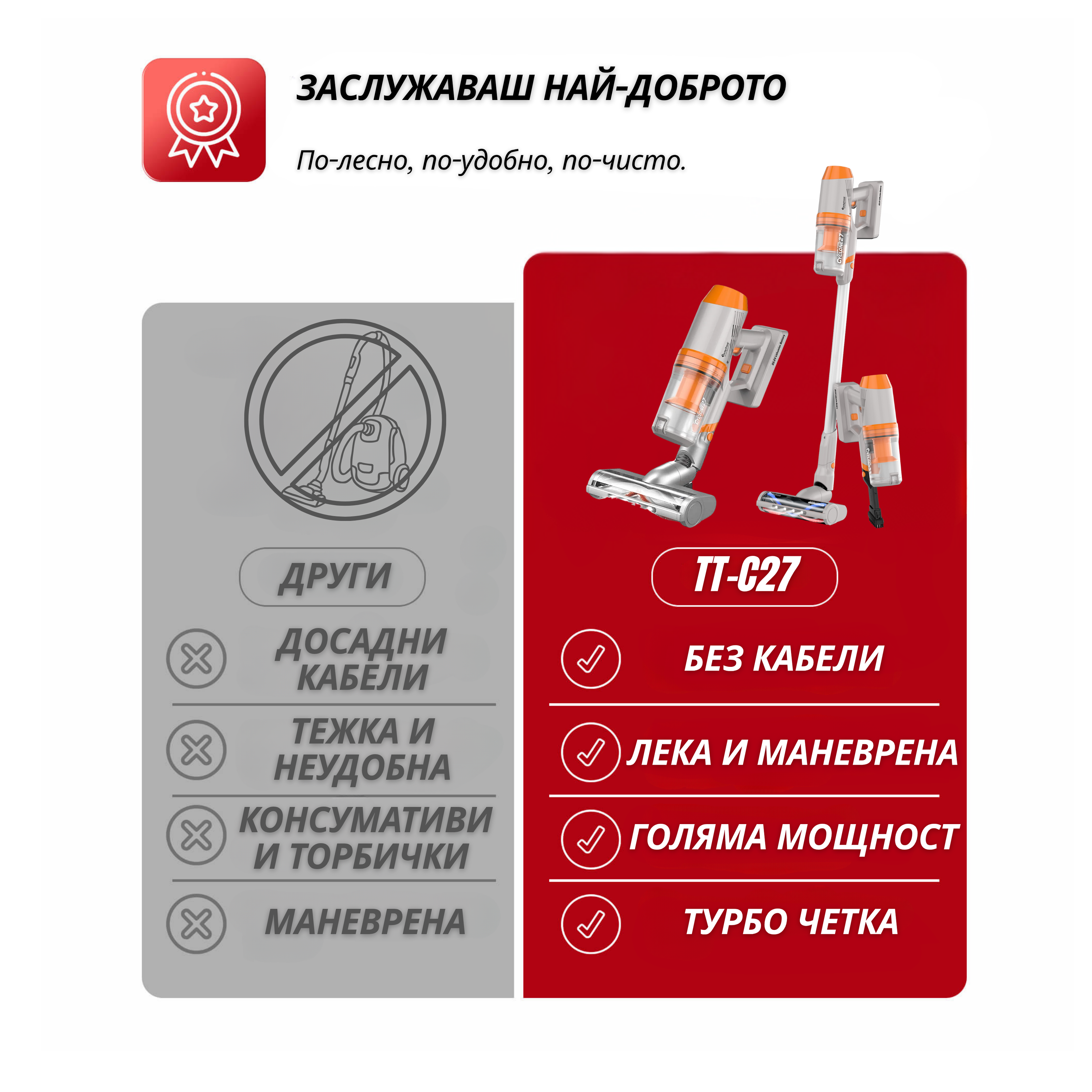 С усъвършенствана всмукателна система и специални накрайници TT-C27 достига и премахва прах и замърсявания от трудно достъпни места.