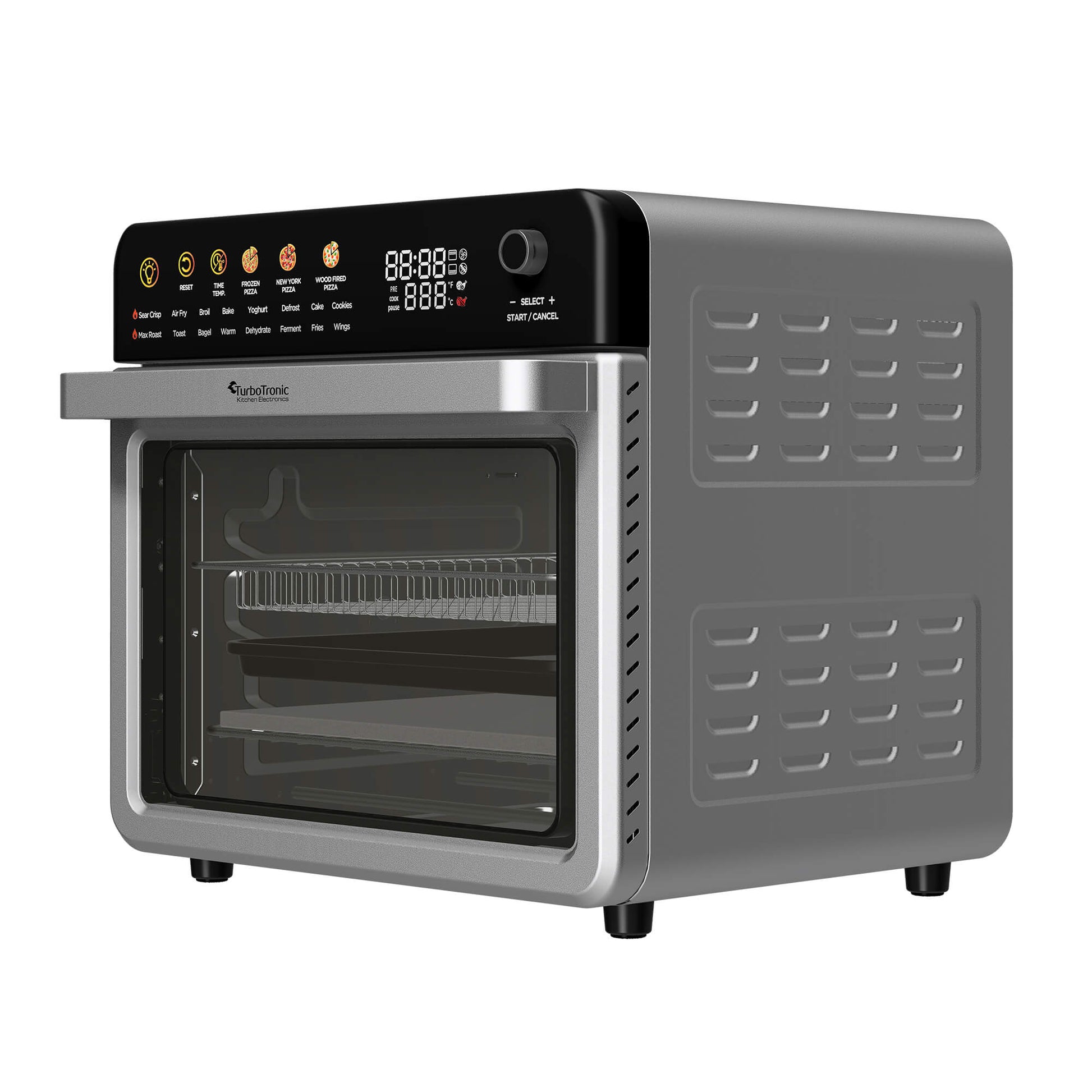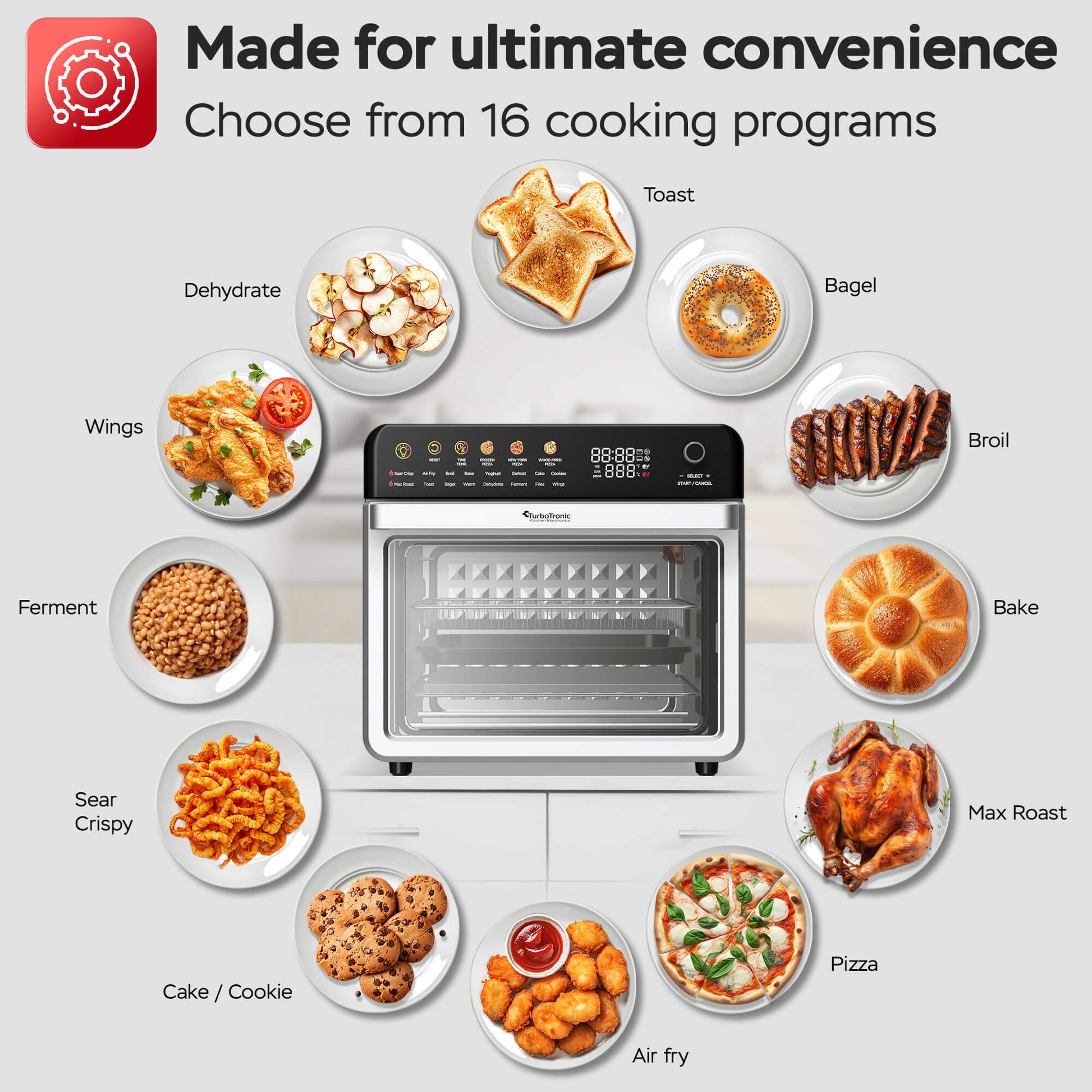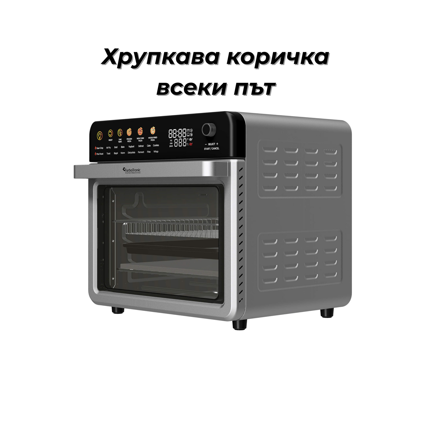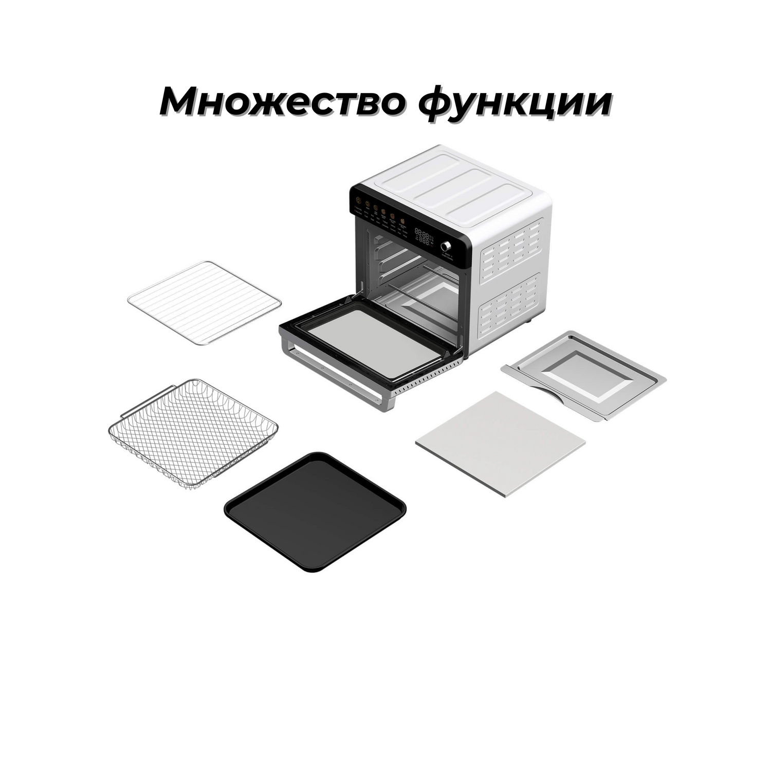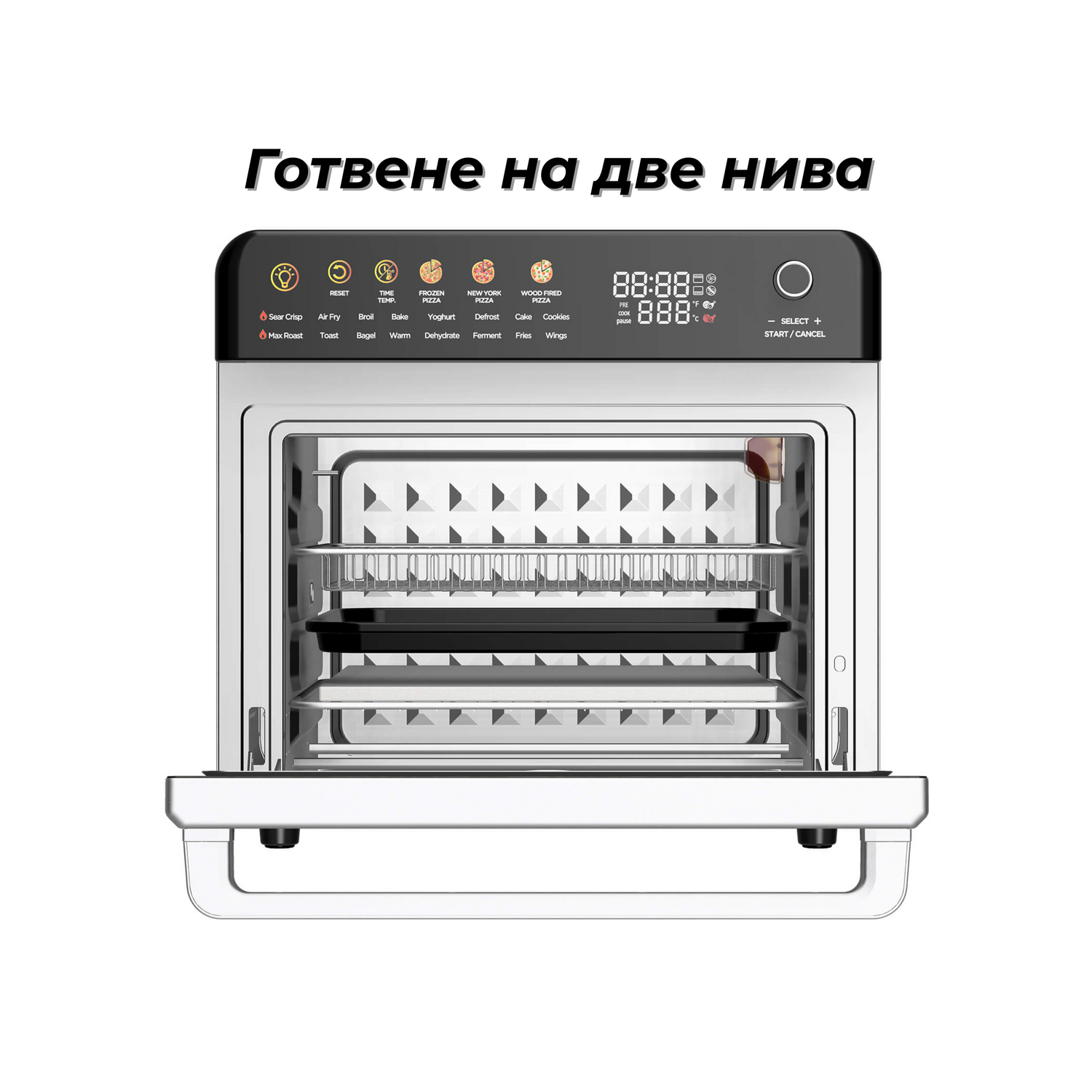 Функции (16): Wings, Fries, Ferment, Dehydrate, Warm, Bagel, Toast, Max Roast, Cake/Cookie, Defrost, Yoghurt, Bake, Broil, Air Fry, Sear Crispy